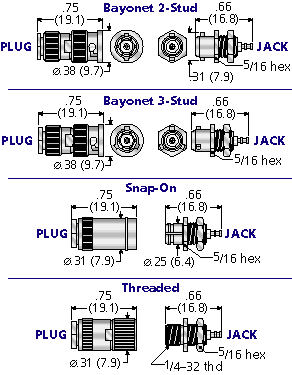 Subminiature, versatile connectors with four mating interfaces to suit varied applications: Bayonet (2-stud): For quick mating and unmating; cannot be accidentally unmated by pulling on cable. Bayonet (3-stud): For quick mating and unmating; three-stud design prevents rocking of mated connectors. Snap-on: For quick mating and unmating with a straight push / pull. Threaded: For secure mating; can be supplied with lockwire holes. All are also available in twinaxial and triaxial versions. Impedance: 50 ohms. Dimensions in inches (millimeters). Formerly designated RF-0700 and RF-3700 series connectors. |